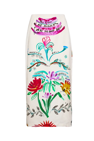 DETAILS: Introducing the Lynne Skirt, a refined midi pencil silhouette in our custom linen-blend anniversary print. Designed with a clean back vent...