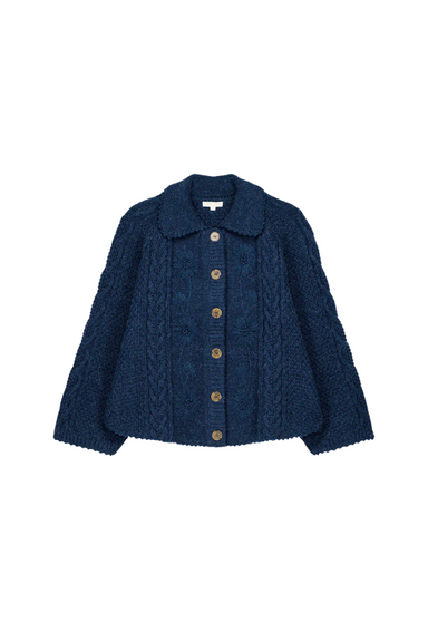 DETAILS: Cape-style cardigan. Small collar with rickrack edges. Front button placket. Full sleeves. Set of stitches, braids, and moss stitches on ...