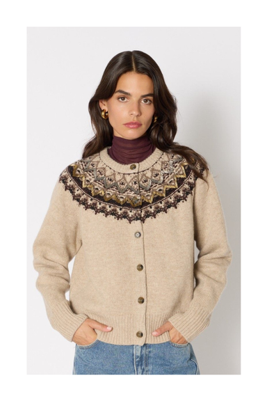 The MAMBOWAVY cardigan stands out with its elegant round neck, enhanced by refined jacquard and delicate pearl embroidery around the collar. A chic...