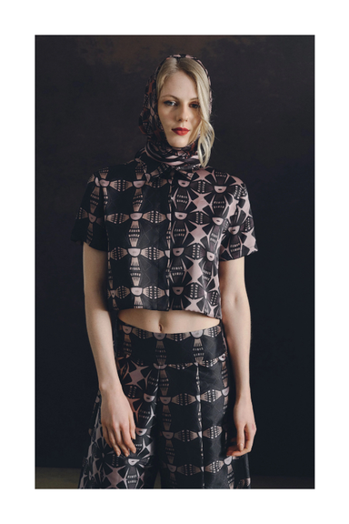 Easy breezy. Cropped top with a collared neckline in lightweight satin, featuring a concealed button placket and short sleeves, in our Mauve Stairs...