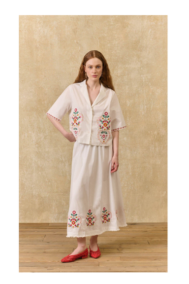 DETAILS: Long skirt in cotton poplin, underskirt-style Slightly flared volume Contrasting embroidery at the bottom, on an embossed latticework bas...
