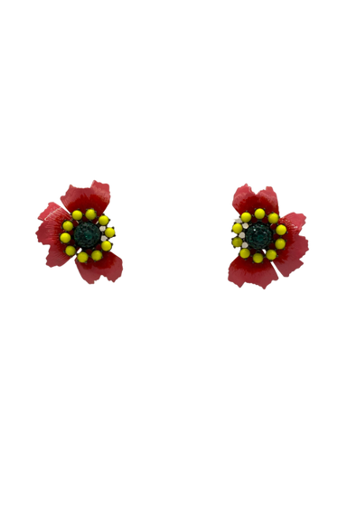 Materials: vintage gold plated brass, enamel, resinDimensions (millimeter): 18 H x 13 WWeight: 3G/eachClosure: Titanium post with navy & poppy ...