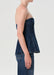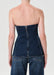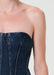 - Looks Like: Dark indigo denim sleeveless corset a-line top