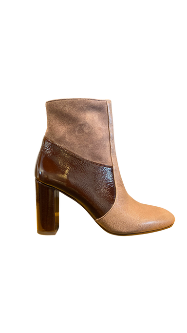 Suede ankle bootie with wrapped tapered. Inside zipper. Leather lining. Rubber outsole. Made in Italy. MEASUREMENTS:Heel Height: 3 inShaft Height: ...