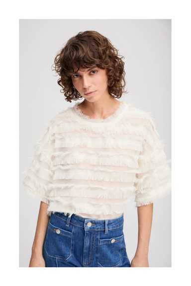 DETAILS: Vintage-inspired blouse in cotton veil. Round neck. Button placket at the back. Inlaid lace on front and sleeves. Embroidered at the fron...
