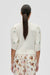 Soft knitted cardigan in off-white with short puff sleeves and delicate floral embroidery. Features a scalloped collar, ribbed trims, and a button-down front.