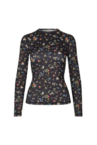 Blouse in shiny black fabric with a multicoloured floral print. Designed with long puffed sleeves, a soft high neckline with a button at the back, ...